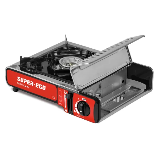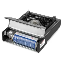 Cocina piezoeléctrico compacta con válvula de doble seguridad ideal para cocinar al aire libre.