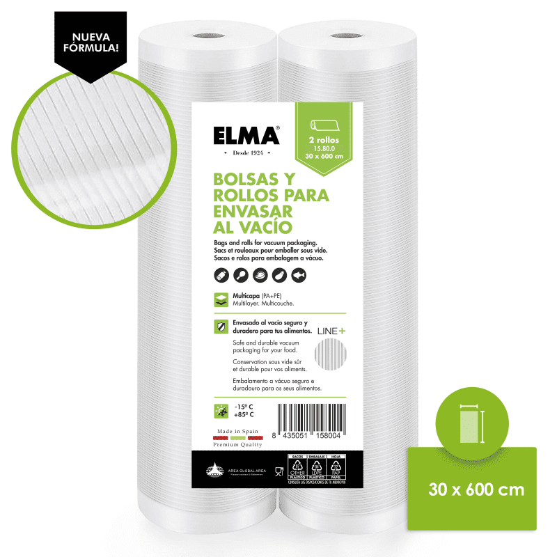 Las bolsas Rayadas LINE+ ELMA tienen 1 capa de Poliamida (PA) entre 2 capas de Polietileno (PE) uno interior y otro exterior para preservar el alimento en mejores condiciones. Combina también una zona lisa de 90 micras, y columnas longitudinales con espesor de 95 micras a lo largo de la bolsa para conseguir una extracción del aire interior más rápido, y asegurar una presión interior óptima. Micra: 90 µ g/m2: 90 Multicapa PA/PE, seguras, herméticas y resistentes. Rango de temperaturas – 15ºC + 85ºC
