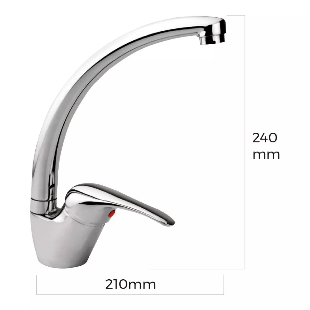GRIFO MONOMANDO DE COCINA. CAÑO ALTO, COLOR CROMADO. MATERIAL: CUERPO DE LATÓN, CON MANGO DE ZINC. CARTUCHO CERÁMICO. INCLUYE: 2 LATIGUILLOS DE CONEXIÓN Y ACCESORIOS DE FIJACIÓN. MEDIDAS: 21 x 24 cm