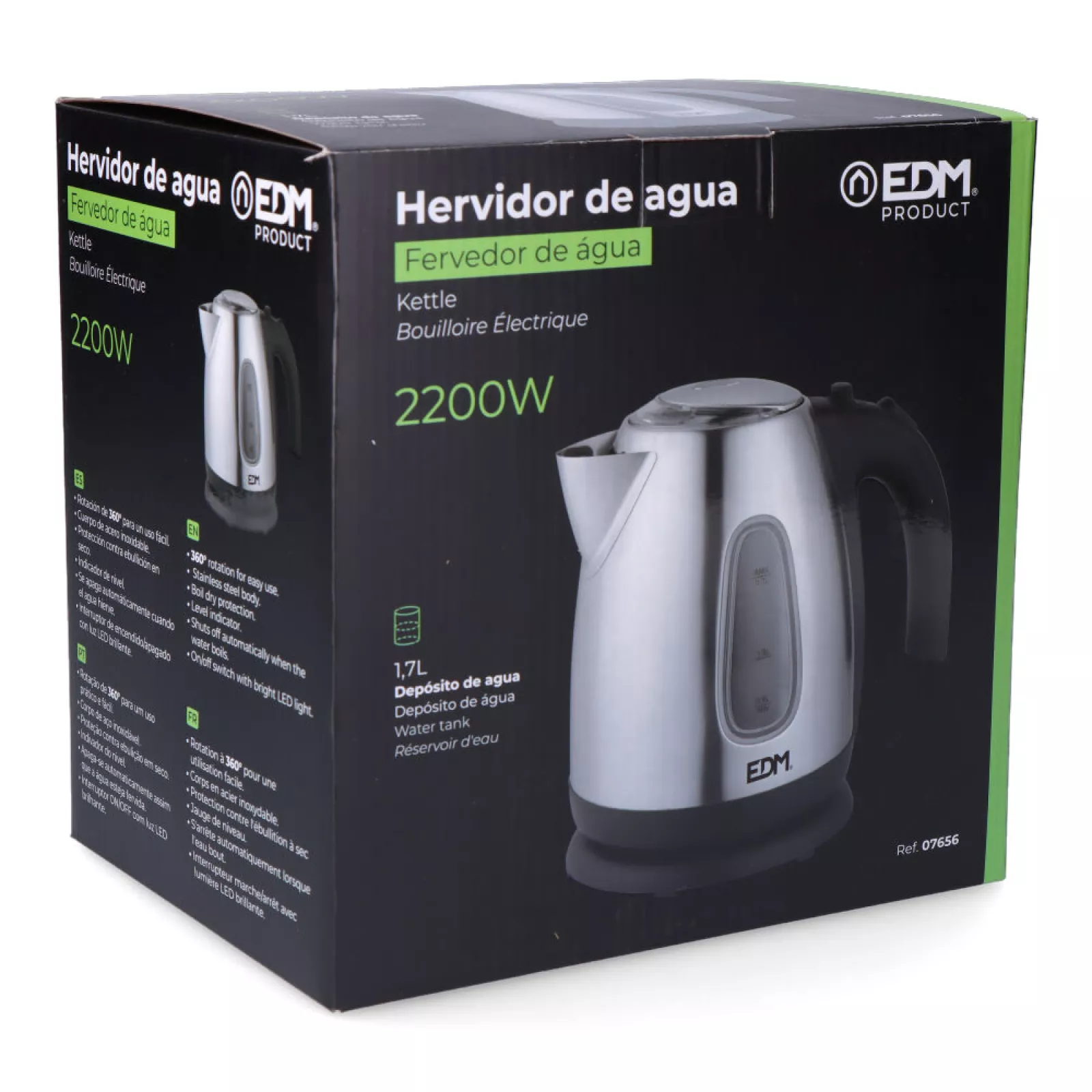HERVIDOR DE AGUA ELECTRICO «KETTLE» POTENCIA: 2200W. 1,7L. TETERA INHALAMBRICA. CUERPO DE ACERO INOXIDABLE. FILTRO DESMONTABLE Y LAVABLE. APAGADO AUTOMATICO Y MANUAL. INDICADOR DE NIVEL. PILOTO LUMINOSO LED. DIMENSIONES: Ø16,5x23cm (diámetro/alto) 220-240V 50HZ EDM. LIBRE DE BPA