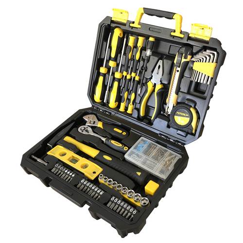 - Contiene 1 alicate universal de 150mm. 1 carraca reversible 1/4″ 9 llaves de vaso 1/4″ – 5,6,7,8,9,10,11,12,13mm 1 llave ajustable 150 mm. 8 llaves allen de 1,5 – 6 mm. 1 martillo, 1 funda goma cabezal martillo. 1 Nivel. 1 cutter 18 mm.