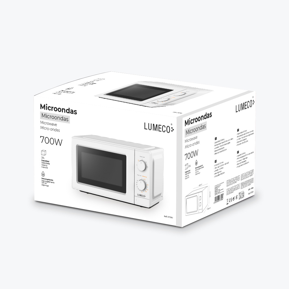 MICROONDAS 700 W BLANCO, CAPACIDAD 20 l, 230 V ~ 50 Hz AC. 5 NIVELES (4 NIVELES + 1 FUNCIÓN DESCONGELACIÓN). FUNCIÓN DE DESCONGELACIÓN CON ELECCIÓN POR PESO O TIEMPO, TEMPORIZADOR HASTA 30 min (CON TIMBRE), CON PLATO GIRATORIO DE Ø24,5 cm, BASE ANTIDESLIZANTE. DIMENSIONES 43,4 x 32,9 x 24,1 cm