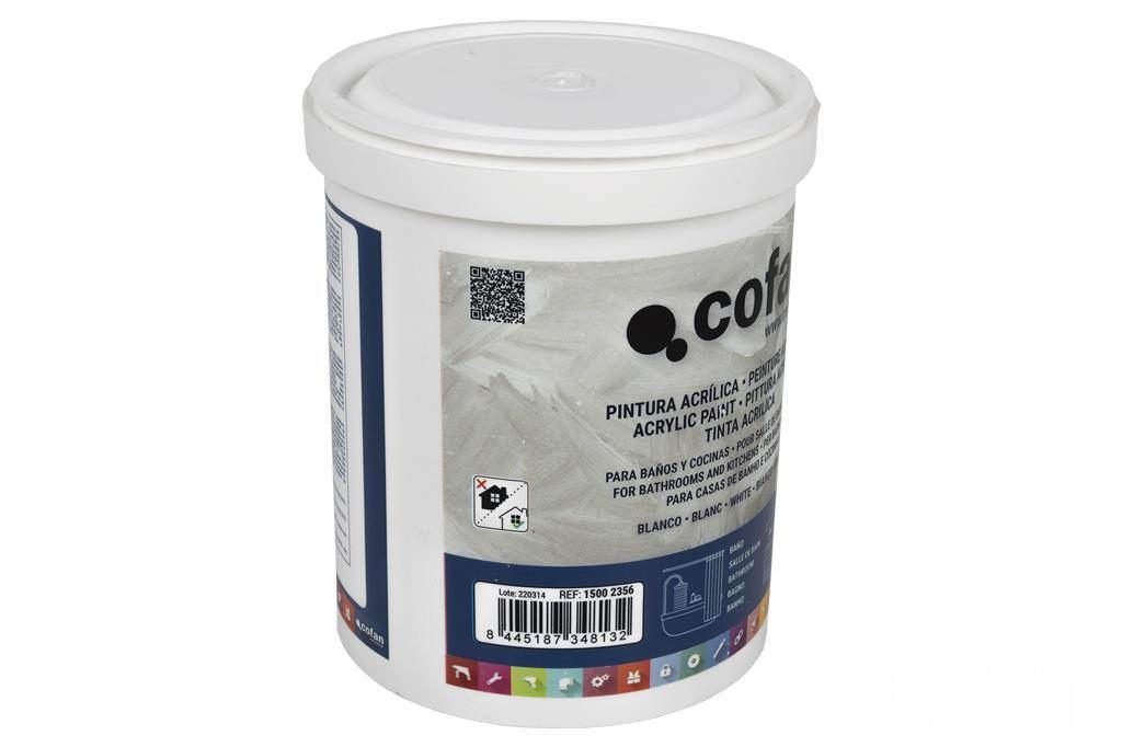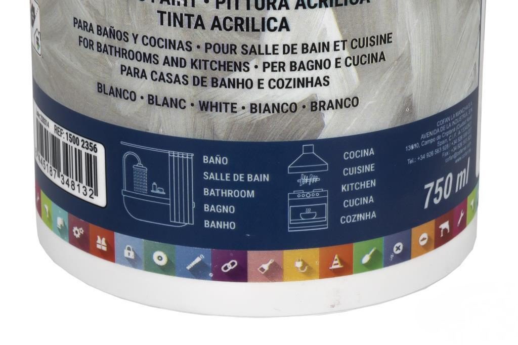 Pintura acrílica especial para baños y cocinas del hogar. La película de pintura aplicada protege frente al ataque de agentes externos, evitando la formación de manchas de mohos y verdines. Bote de 750 ml en color blanco.