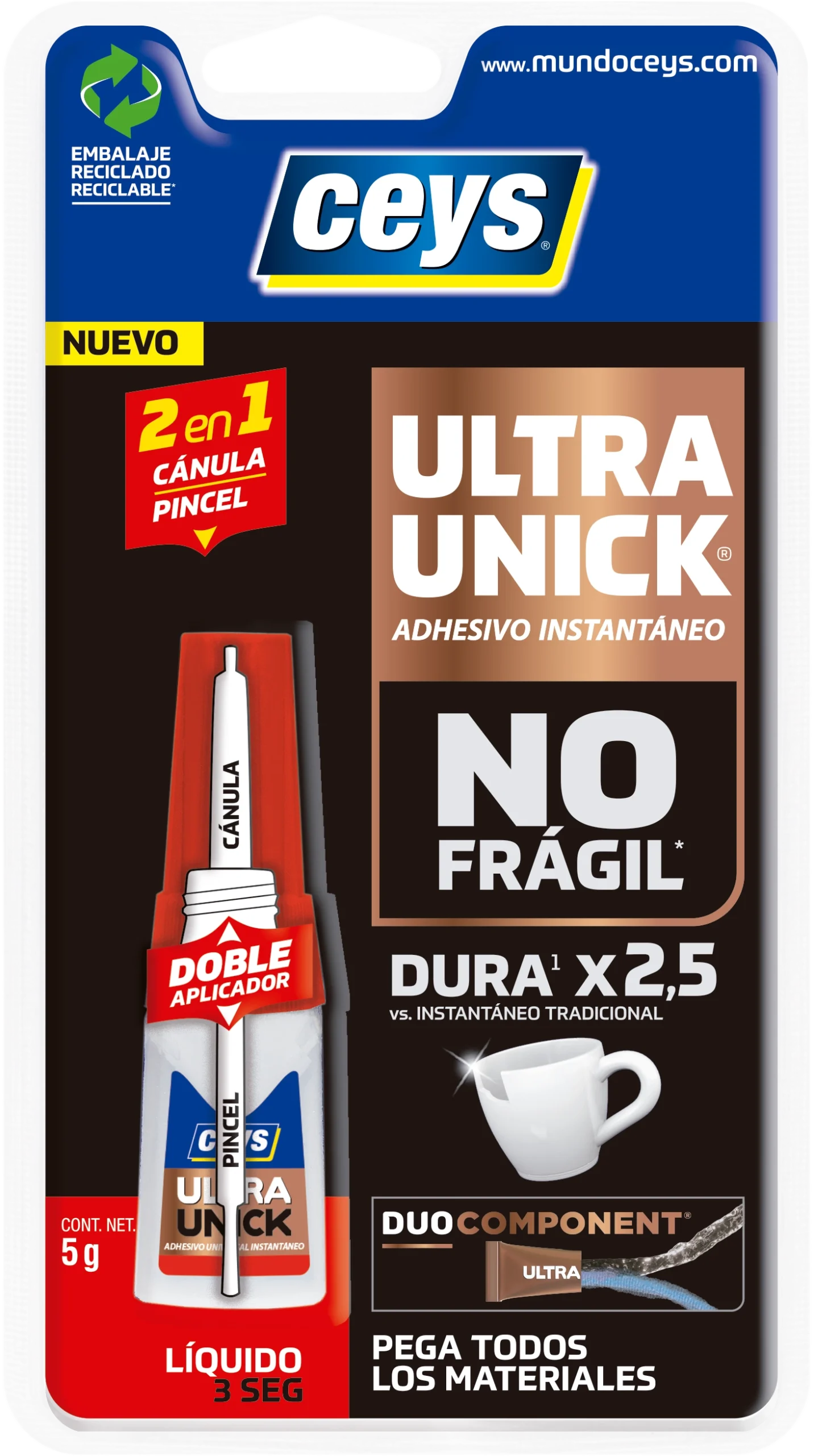 Ultraunick es el adhesivo universal instantáneo NO FRÁGIL , ultra rápido y seguro. Dura 2,5 veces más que un instantáneo tradicional. Proporciona una unión perfecta en 3 segundos. Pega TODOS LOS MATERIALES